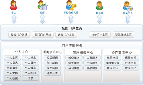围绕门户在学校的需求目标,校园信息门户应用可以划分为个人中心、新闻资讯中心、应用服务中心和协作交流中心四大部分。