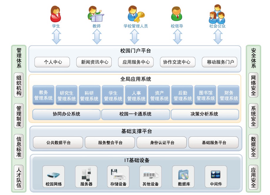 针对近年来高校数字化校园建设的实际需求和未来的发展趋势,结合我们最近几年在高校信息化建设领域的成果和经验,从学校信息化整体规划的高度出发,我们提出了高校数字化校园整体框架